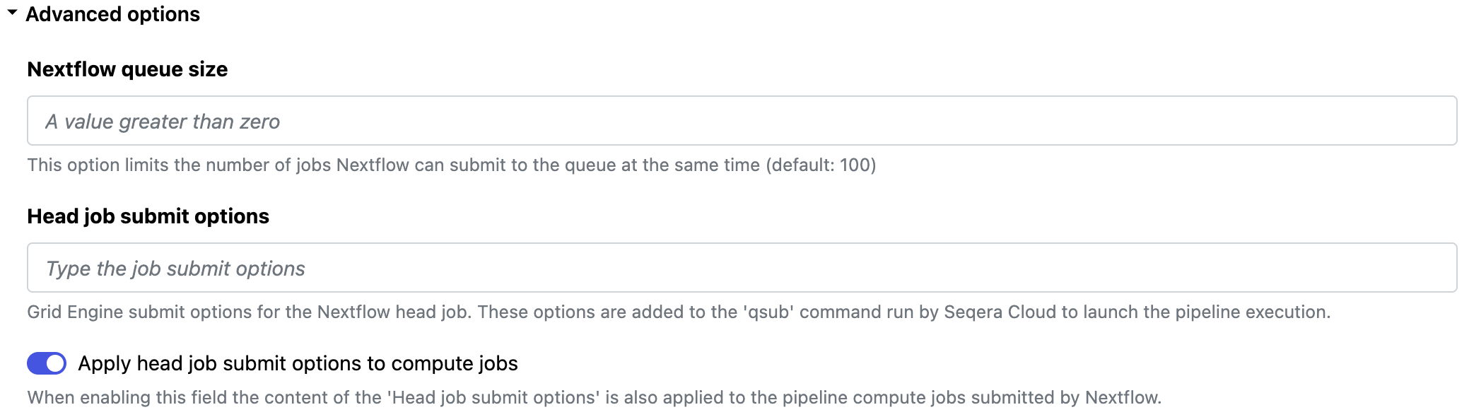 - Use the Head job submit options to specify platform-specific submit options for the head job. You can optionally apply these options to compute jobs as well: